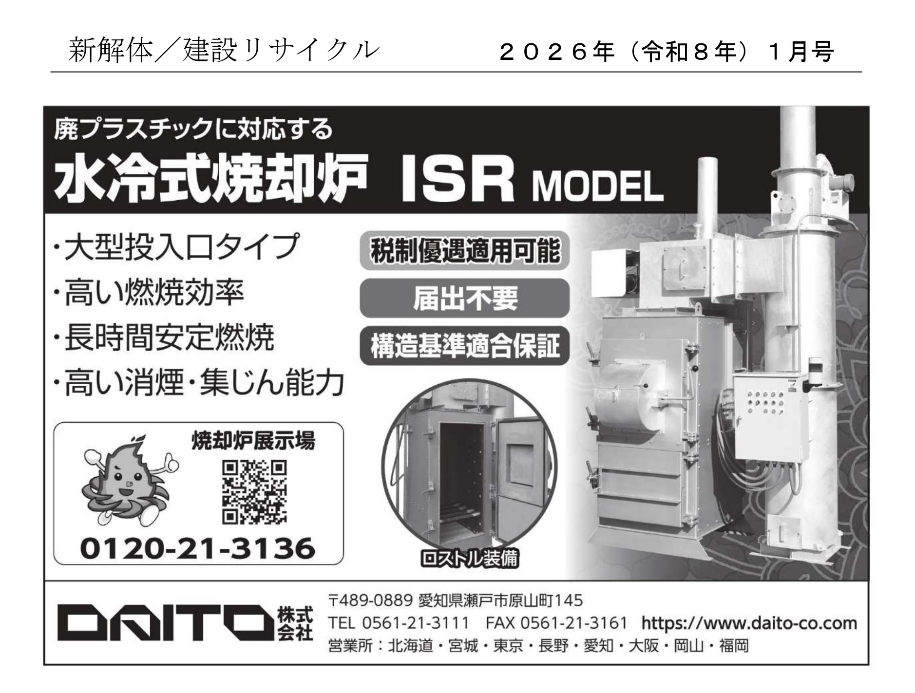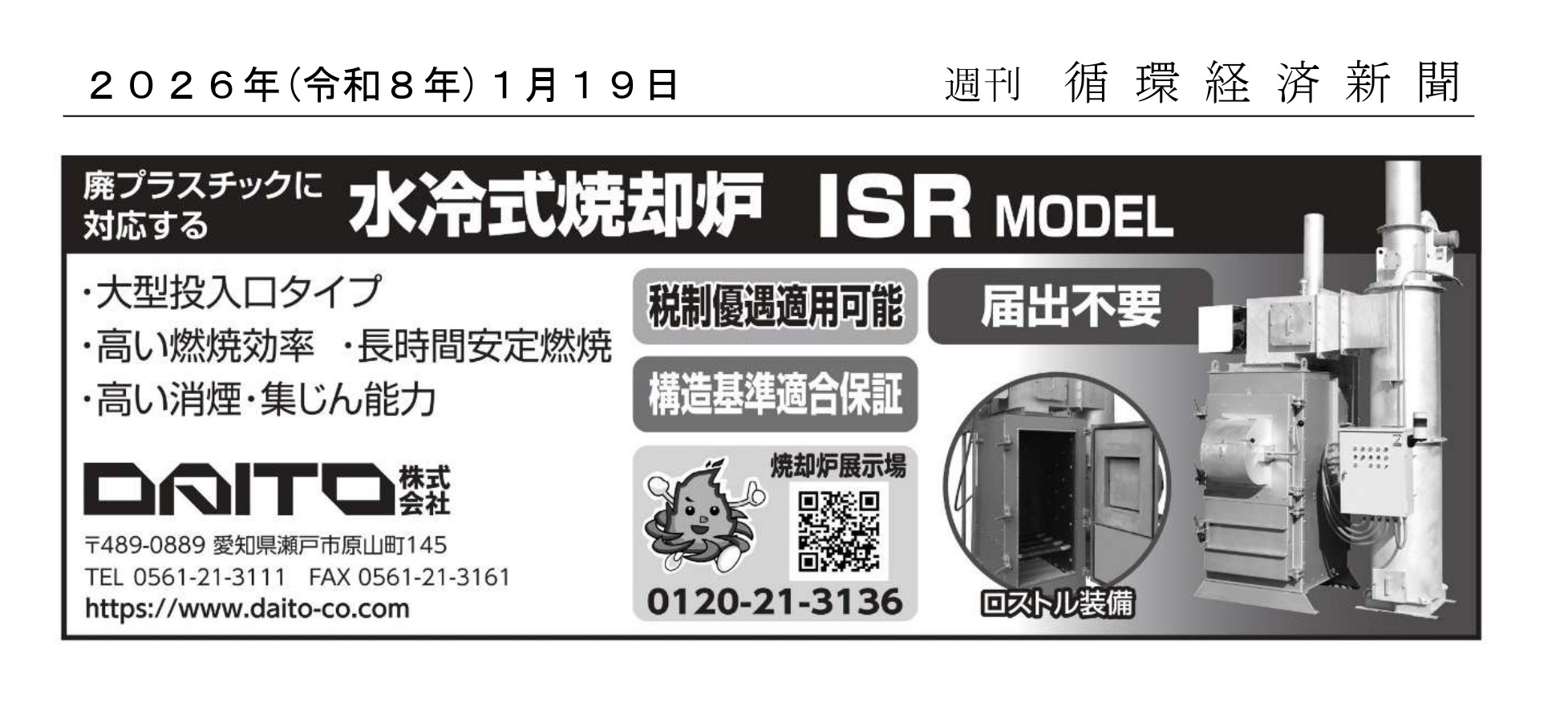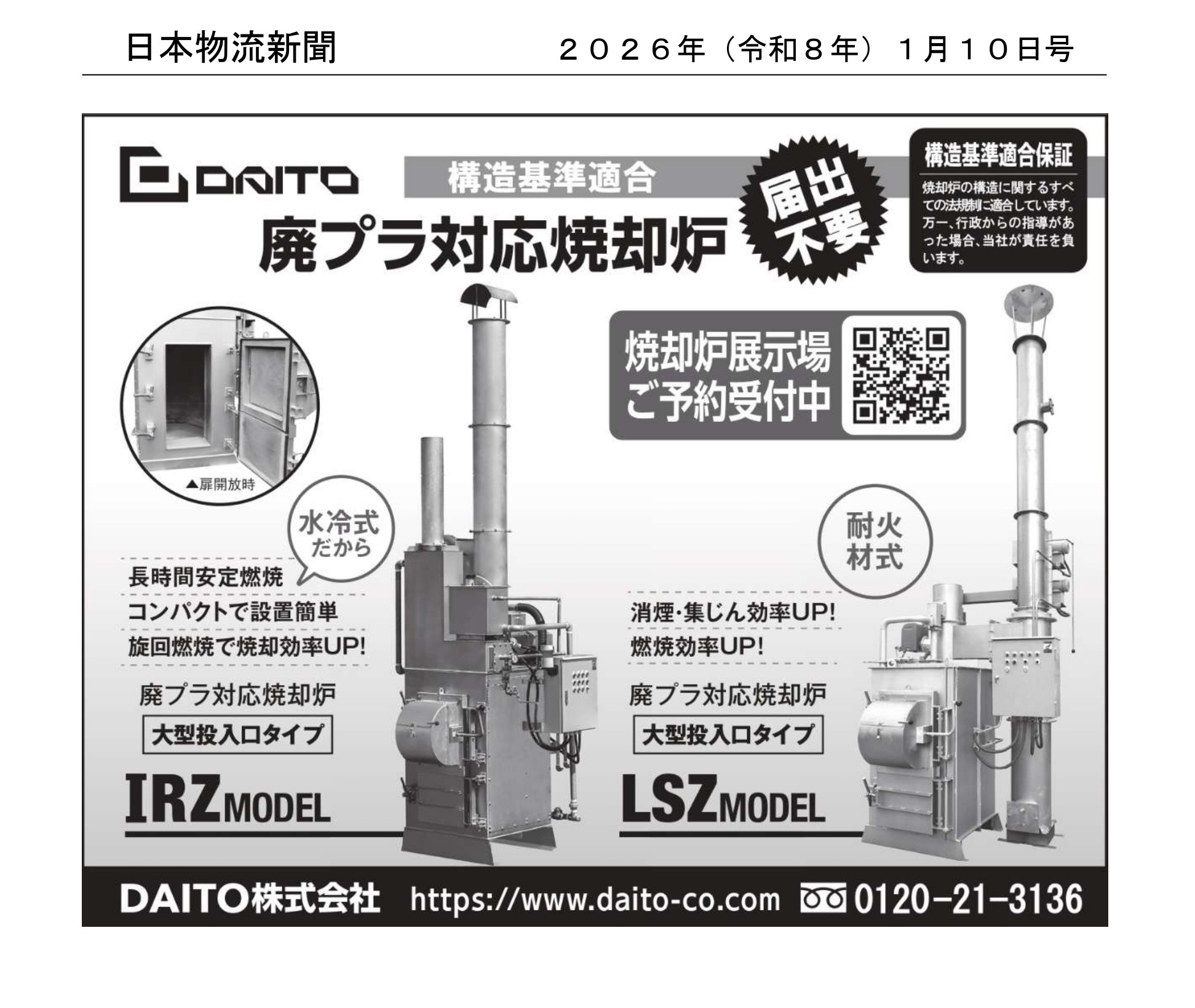 HOME 焼却炉購入サポート メディア情報 メディア情報 循環経済新聞 2026年1月19日 ISRモデルの広告が掲載されました。 PDFはこちらから 日本物流新聞 2026年1月10日 IRZモデル、LSZモデルが掲載されました。 PDFはこちらから 新解体/建設リサイクル 2026年1月号 ISRモデルの広告が掲載されました。 PDFはこちらから 鶏鳴新聞 2025年11月15日 SPZモデルの記事が掲載されました。 PDFはこちらから 鶏鳴新聞 2025年10月25日 SPZモデルの記事が掲載されました。 PDFはこちらから 日本物流新聞 2025年9月25日 IRZモデル、LSZモデルが掲載されました。 PDFはこちらから 鶏鳴新聞 2025年9月25日 IRZモデルの記事が掲載されました。 PDFはこちらから 鶏鳴新聞 2025年9月25日 IRZモデルの広告が掲載されました。 PDFはこちらから 新解体/建設リサイクル 2025年9月号 IRZモデルの広告が掲載されました PDFはこちらから 輸送経済新聞 2025年7月29日 IRZモデル・LSZモデルの広告が掲載されました。 PDFはこちらから 1 2 3 4 5 6 … 28 次へ » 製品 焼却炉製品ラインナップ 中文目录/中文目錄中国語カタログ 構造基準適合保証 製品検索 焼却炉情報 関連法規 埼玉県条例 税制優遇措置 焼却炉Q&A 処理費用を無駄にかけていませんか ストップ野焼き わたしたちが作りました 焼却炉購入サポート 焼却炉展示場 オンライン展示場 お客様の声 展示会情報 DAITO実演会 展示会風景 メディア情報 プロモーションビデオ DAITOについて 会社案内 採用情報 お問い合わせ