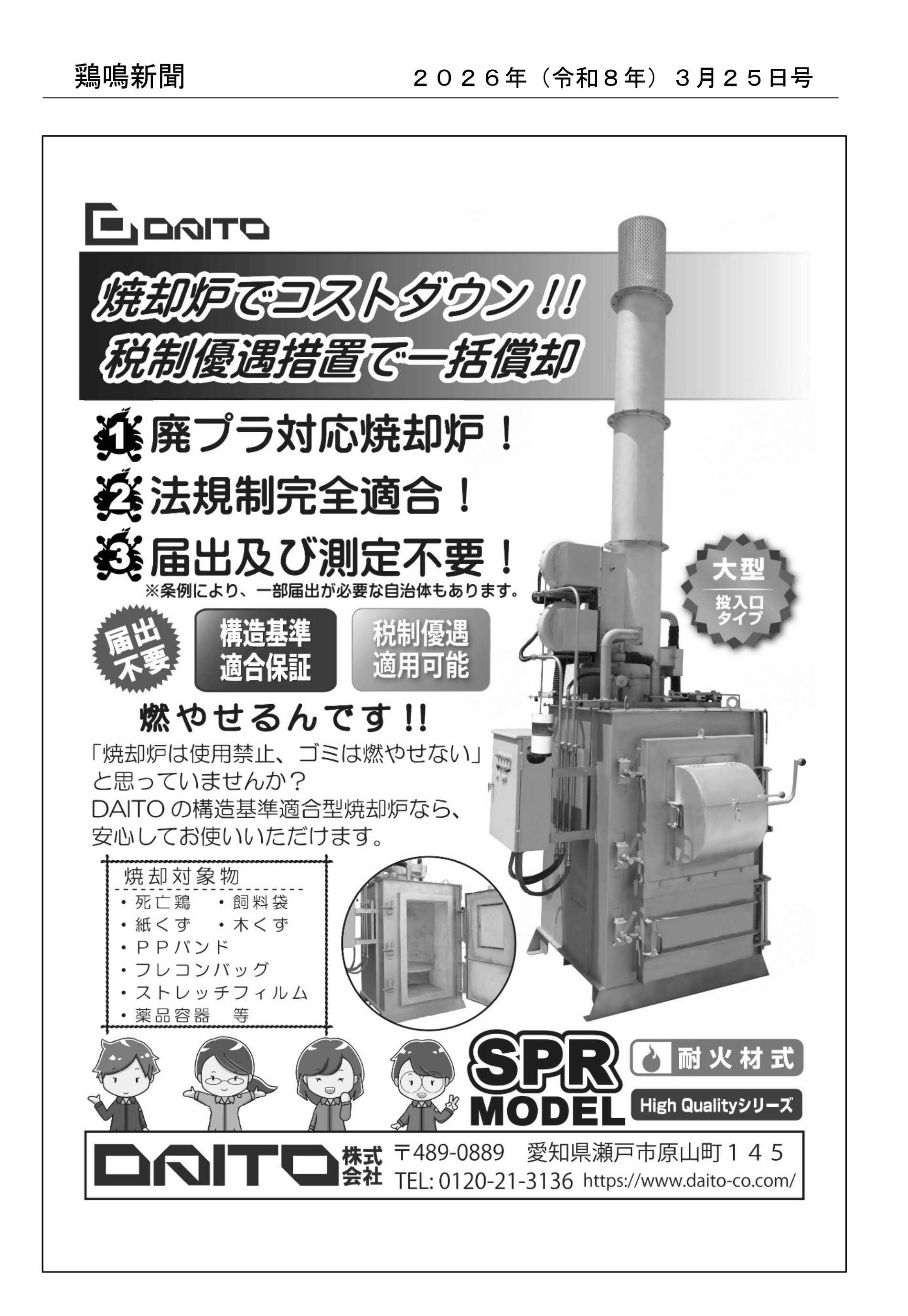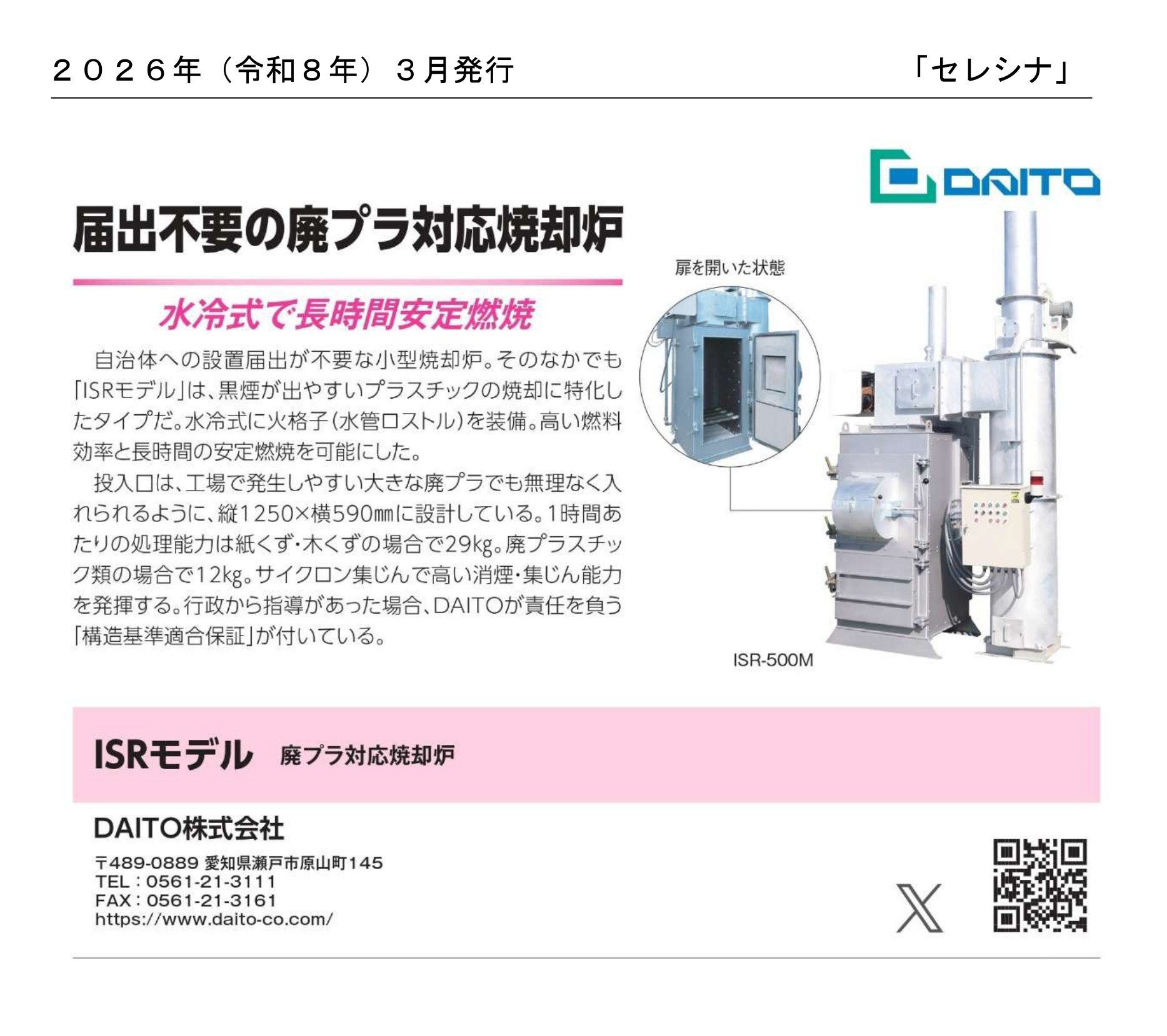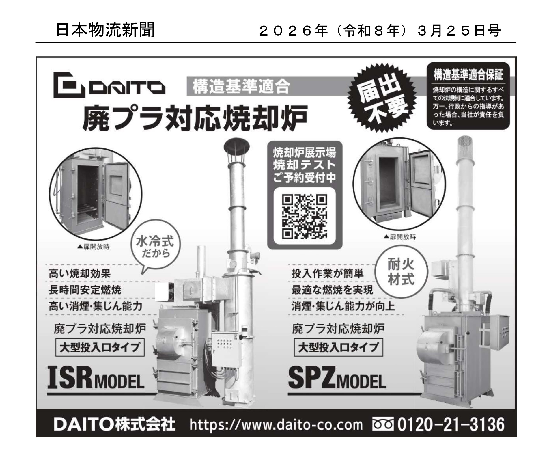 HOME 焼却炉購入サポート メディア情報 メディア情報 日本物流新聞 2026年3月25日 ISRモデル、SPZモデルが掲載されました。 PDFはこちらから セレシナ(株式会社山善発行) 2026年3月 ISRモデルの広告が掲載されました。 PDFはこちらから 鶏鳴新聞 2026年3月25日 SPRモデルの広告が掲載されました。 PDFはこちらから 鶏鳴新聞 2026年2月25日 IRZモデルの広告が掲載されました。 PDFはこちらから 日本物流新聞 2026年2月10日 SPZモデルの記事が掲載されました。 PDFはこちらから 日本物流新聞 2026年2月10日 ISRモデル、SPZモデルが掲載されました。 PDFはこちらから 鶏鳴新聞 2026年1月25日 SPRモデルの広告が掲載されました。 PDFはこちらから 循環経済新聞 2026年1月19日 ISRモデルの広告が掲載されました。 PDFはこちらから 日本物流新聞 2026年1月10日 IRZモデル、LSZモデルが掲載されました。 PDFはこちらから 新解体/建設リサイクル 2026年1月号 ISRモデルの広告が掲載されました。 PDFはこちらから 1 2 3 4 5 6 … 28 次へ » 製品 焼却炉製品ラインナップ 中文目录/中文目錄中国語カタログ 構造基準適合保証 製品検索 焼却炉情報 関連法規 埼玉県条例 税制優遇措置 焼却炉Q&A 処理費用を無駄にかけていませんか ストップ野焼き わたしたちが作りました 焼却炉購入サポート 焼却炉展示場 オンライン展示場 お客様の声 展示会情報 DAITO実演会 展示会風景 メディア情報 プロモーションビデオ DAITOについて 会社案内 採用情報 お問い合わせ